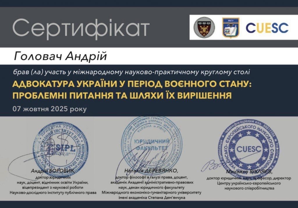В роботі круглого столу прийняли участь адвокати, вчені з України, Іспанії, Великої Британії та Північної Ірландії, у т.ч. директор Інституту права Донецького університету економіки та права, доктор юридичних наук, професор, заслужений юрист України, академік Національної академії вищої освіти України, адвокат Андрій ГОЛОВАЧ.